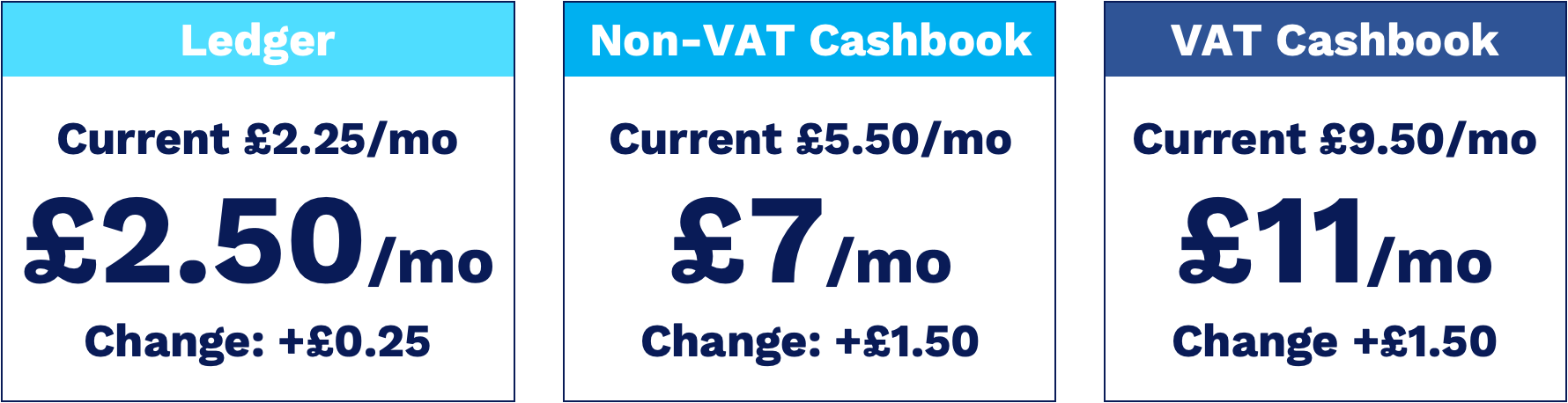From 5 March 2024, the monthly prices of the Ledger, Non-VAT Cashbook and VAT Cashbook plans will change to: